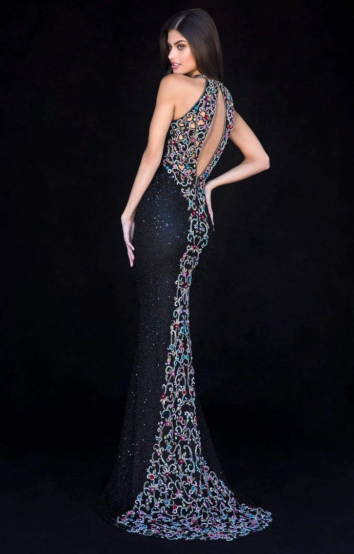 Make it your night worth reminiscing in this decadent Sherri Hill 51739. This long fitted trumpet dress is beaded throughout with contrasting bead details. It features halter neckline, keyhole back style, and a sweep train for a dramatic entrance. The perfect details of this Sherri Hill make it the best choice at your Prom, Military Ball or at any formal evening event.