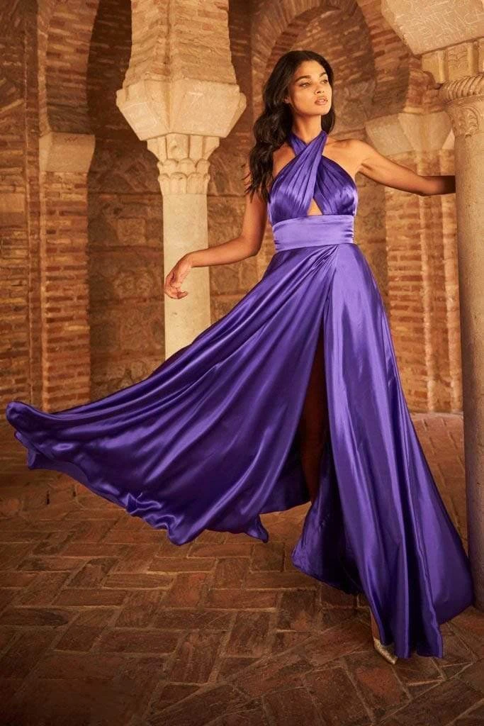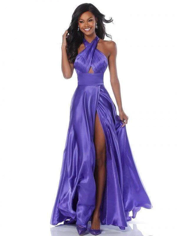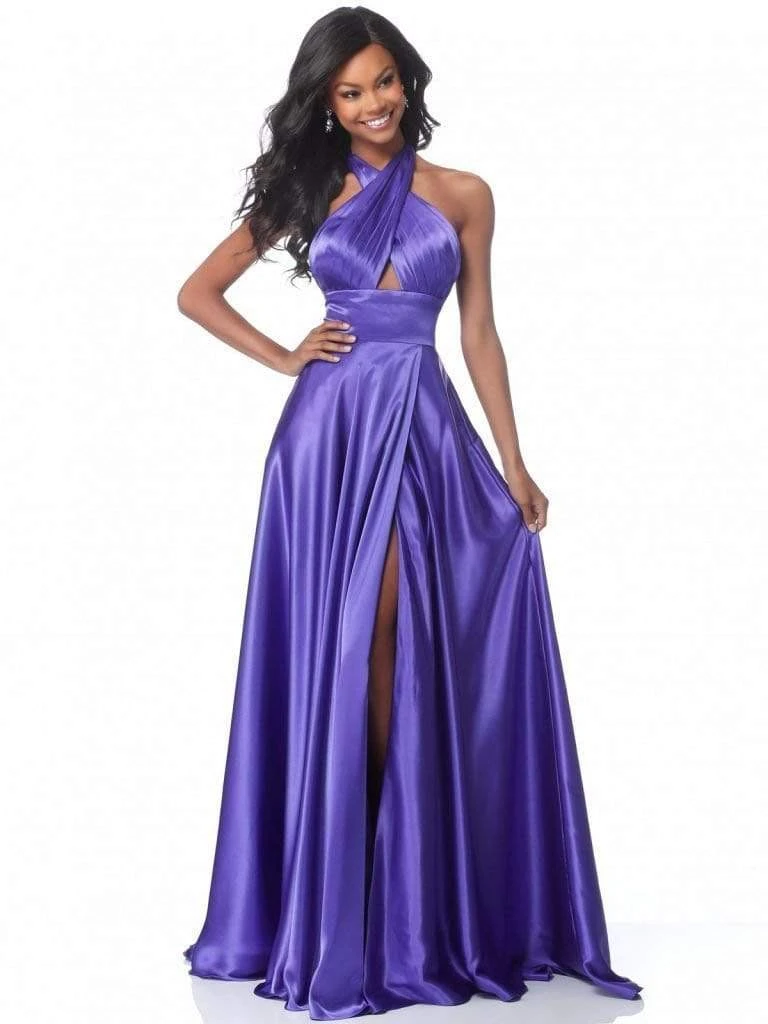 Shine like a knockout in this stunning Sherri Hill 51897 creation. Draped in a satin charmeuse fabric that ruches at the bodice, this dress shows a crisscross halter neckline with a cutout. Nipped with an empire waistband, the lush A-line skirt opens up with a high slit as it cascades into a sweeping train. Look like a glorious vision at your party in this Sherri Hill masterpiece. Models are wearing the Emerald and Purple colors.