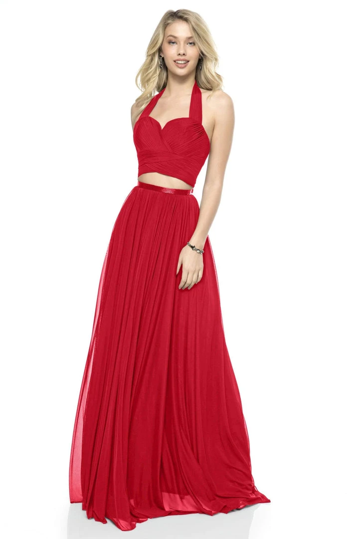 Steal the show at prom with this stunning Sherri Hill 51900 piece. This two piece ensemble features a fitted ruched crop top with a sweetheart neckline and halter straps which leads to the open back. The a-line skirt sweeps the floor so gracefully while the tonal bugle beaded waist adds a touch of shimmer. Charm them all in this adorable Sherri Hill ensemble.