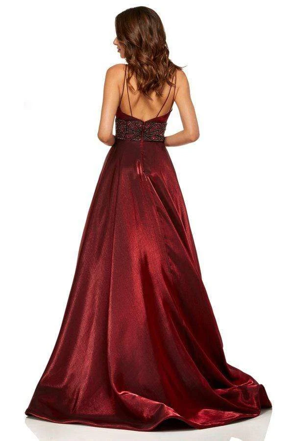 Dare to express yourself in this brazen gown from Sherri Hill 52423. Fashions a sleeveless, scoop neckline with spaghetti straps supporting the fitted bodice. The waist is wrapped in a beaded band and flourishes a ballgown skirt with a sweep train finish. Dress to the nines in this glam style by Sherri Hill.