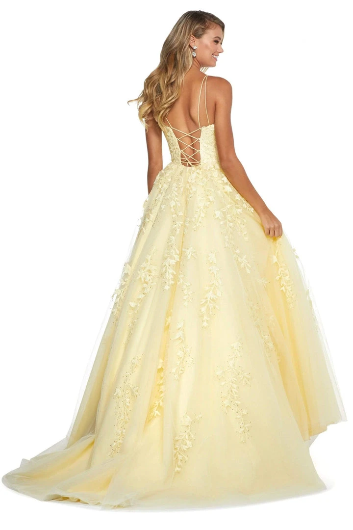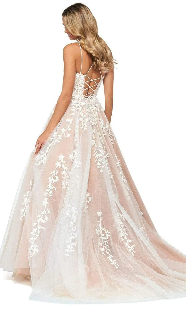 Get noticed in this radiant dress by Sherri Hill 53116. Floral lace embroidery overlays this sleeveless gown, featuring a slim ballgown silhouette with a modest scoop neckline with dual spaghetti straps and a corset lace-up back. This beautiful ensemble finishes with a multi-layered skirt that cascades to a brush train. Make it a romantic occasion with this creation by Sherri Hill. Find more formal dresses!