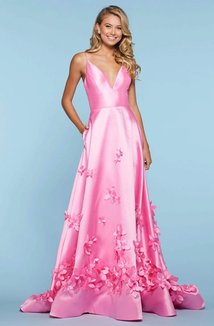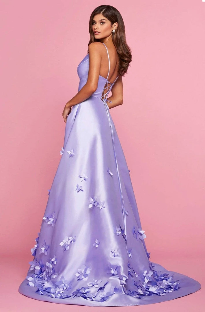 Enthrall everyone by the sheer femininity of this Sherri Hill 53337 creation. Rendered in a magnificent Mikado fabric, this dress flaunts a plunging v-neckline and stringed with spaghetti straps. Embraced with a wide banded empire waist and cinched with a lace up tie back, dimensional floral appliques ornate this voluminous A-line skirt and train. Have all eyes gravitate towards you in this tantalizing Sherri Hill masterpiece. Models are wearing the Candy Pink and Lilac colors.