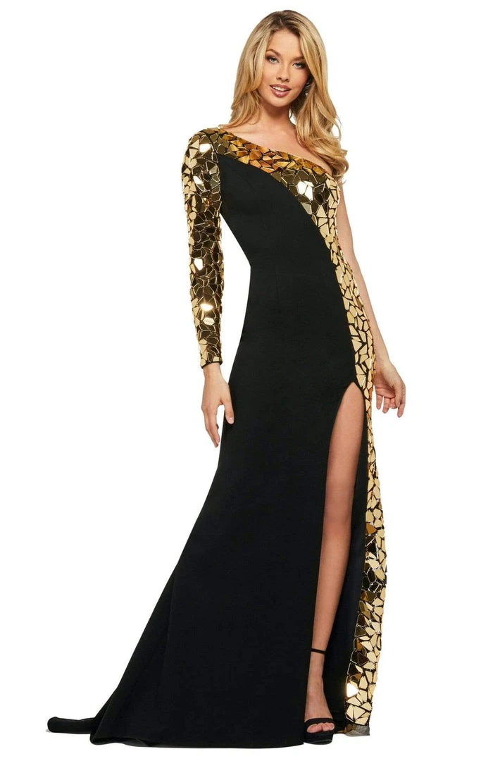 Create a perfect evening wearing this elegant Sherri Hill 53467. Gorgeously adorned with cut glass details, this creation features an asymmetrical neckline, single long sleeve, and a zipper closure. The sheath silhouette skirt features a high-leg slit, and a sweep train. The night is yours in a spectacular gown from Sherri Hill. Model is wearing black/gold.