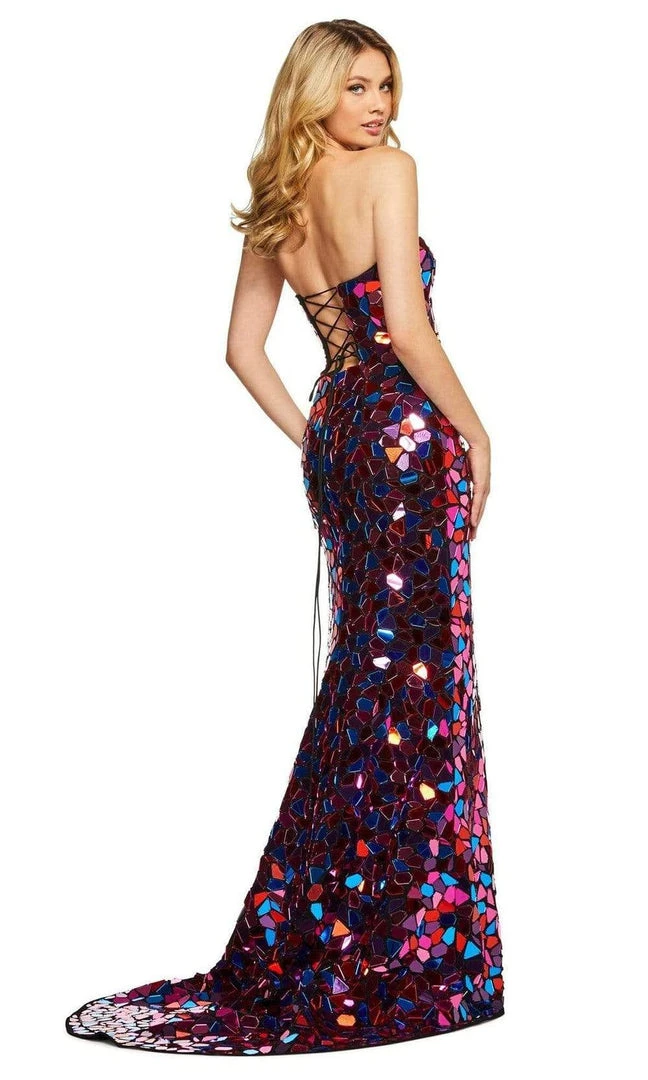Bring a breathtaking new look to prom night in this stunning Sherri Hill 53474 special occasion dress. Tailored with a straight-across neckline, this strapless beauty is adorned with cut glass detailing all over the dress, and a lace-up open back. Top complete the look is a sheath silhouette skirt with a high-leg slit that features a sweep train. Dance all night in this dazzling creation from Sherri Hill. Model is wearing Black/Multi color. Find more formal gown!