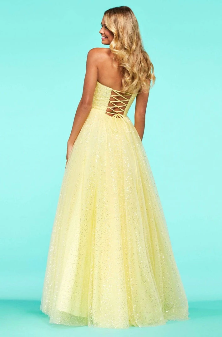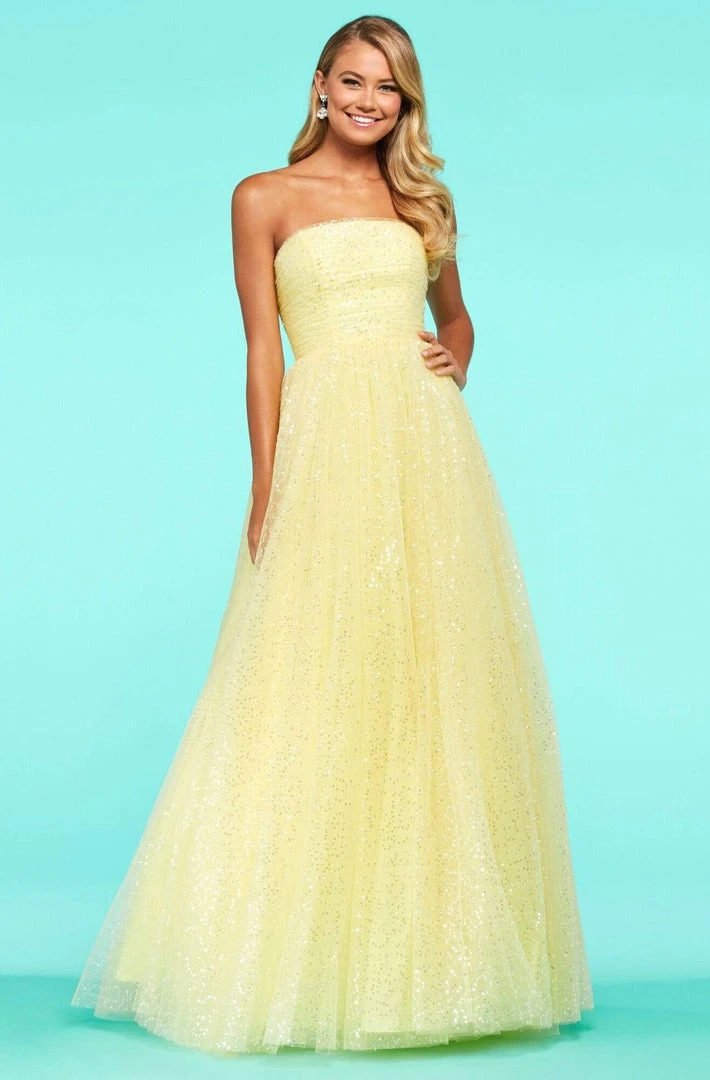 Revel in the whimsical sense of this breathtakingly ornate Sherri Hill 53638 creation. Impressively festooned with sequins on a tulle fabric, this dress flaunts a straight-across neckline on a strapless bodice. Adorned with intricate tucks on a fitted bodice, a corset style ties up the back. The embellished A-line skirt twinkles as it fascinatingly ends in a train. Look phenomenal in this extravagant Sherri Hill masterpiece. Model is wearing the Yellow color.