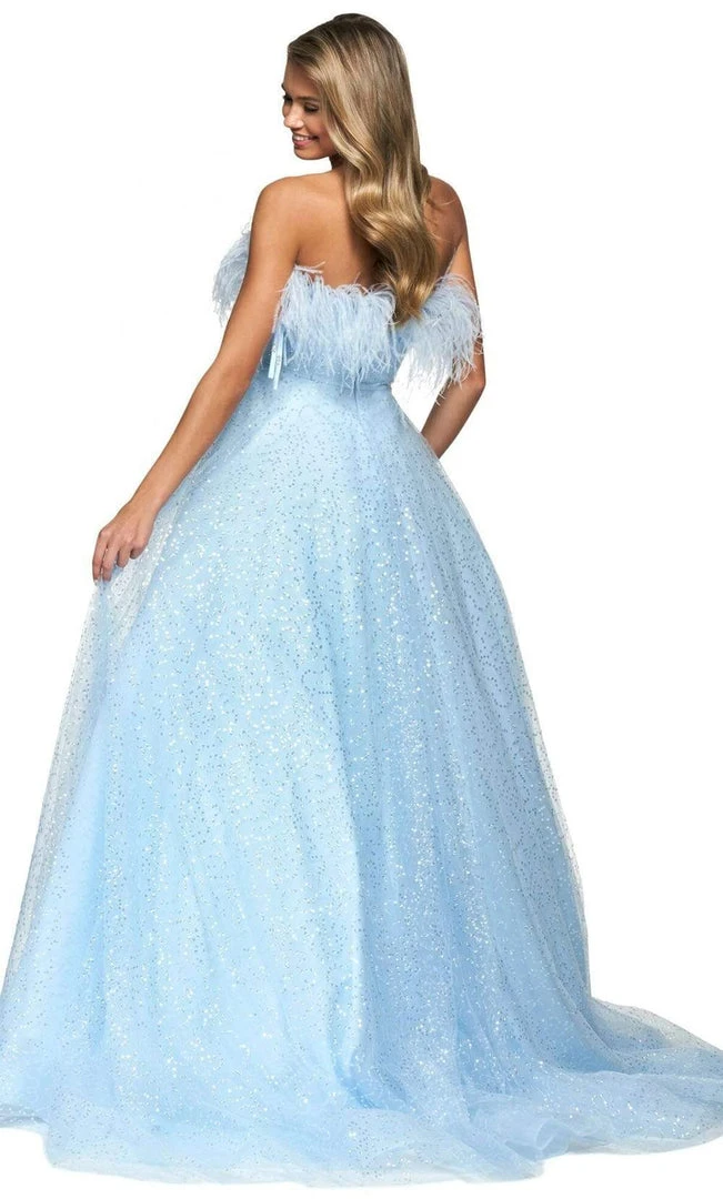 Be divined as a total stunner this Sherri Hill 54048 creation. Capturing shine with glittering chiffon layers, this strapless piece flaunts a straight across neckline with an open back frothing with ostrich feathered details. Layer of sumptuous skirt spills into a semi-ballgown finish with a train. Glow with opulence in this Sherri Hill masterpiece.