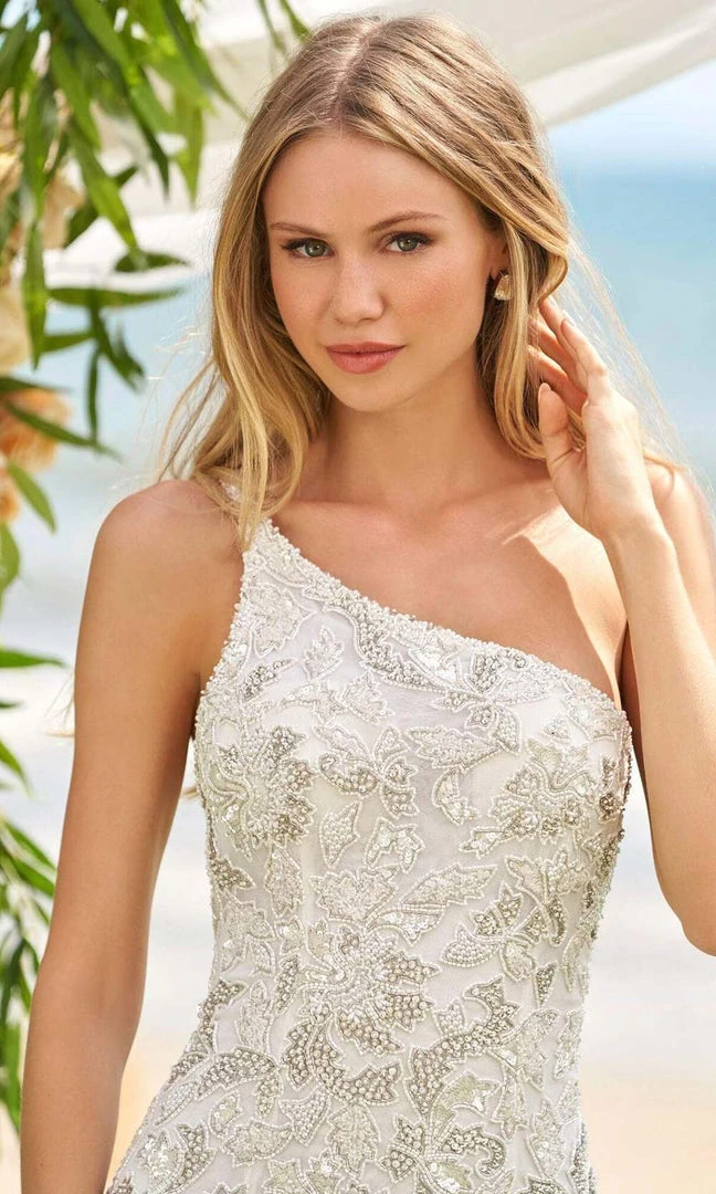 Bring a sleek vibe to formal wear with this perfectly simple dress in sheath silhouette by Sherri Hill 54803. This fabulous dress opens in a unique asymmetric neckline that descends to an even more fabulous sheath skirt revealing a front slit. The dress is layered with an embellished chiffon fabric, making this dress an effortless standout. Feel dainty and feminine in this enchantingly designed evening gown by Sherri Hill. Model is wearing Ivory color.
