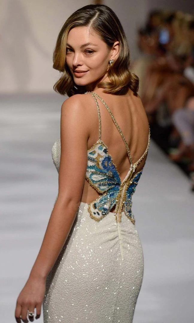 | Details: | Sleeveless, Spaghetti straps, Fitted bodice, Plunging neckline, Butterfly back, Back zipper, Floor length |