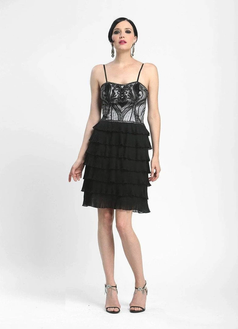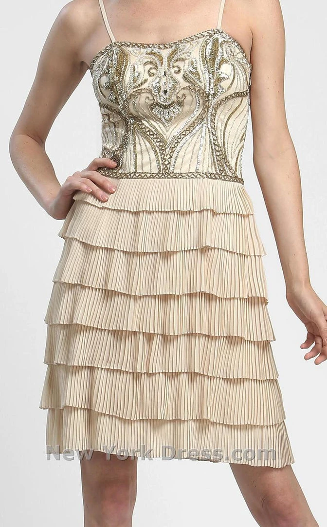 Make a stroke of brilliance as you mesmerize in this classy Sue Wong N4100 creation. Lavishly adorned with a display of glamorous scroll beadwork, this stylish piece shows a modified sweetheart neckline framed with thin, spaghetti straps and an ornate mid-open back. Impeccably cascading with intricately pleated tiers that alluringly ruffles, the sheath skirt hovers just along the mid-thighs for that divinely unique vintage-inspired style. Flourish a panache that is meant to be unforgettable in this precious Sue Wong masterpiece. Models are wearing the Champagne and Black/Platinum colors.