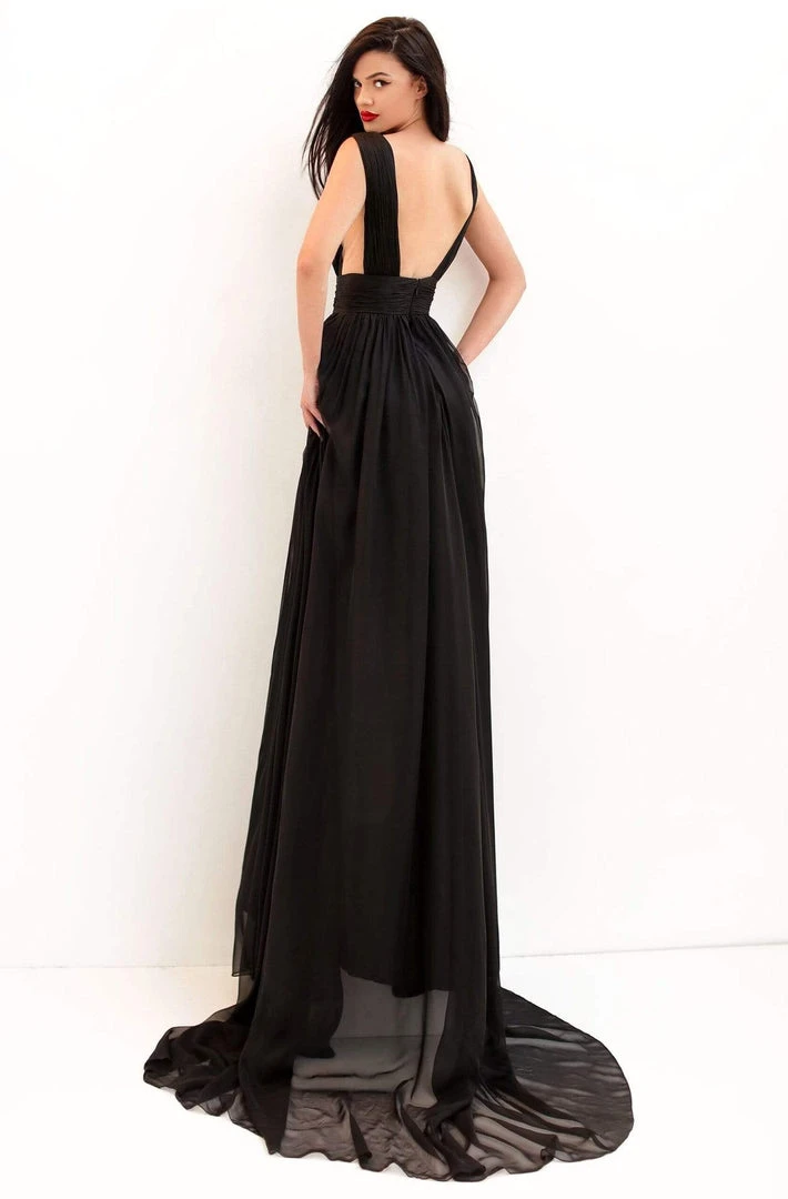 Get glam in this fabulous dress from Tarik Ediz 50690. This daring dress fashions a sleeveless, deep V-neckline with ruched bodice showing off an open back. It has a zipper closure and the sheath skirt is accented with appliques. The skirt is detailed with a high slit and a sweep train finish. Optimize the attraction of your special event in this alluring dress by Tarik Ediz. Model is wearing Black color.
