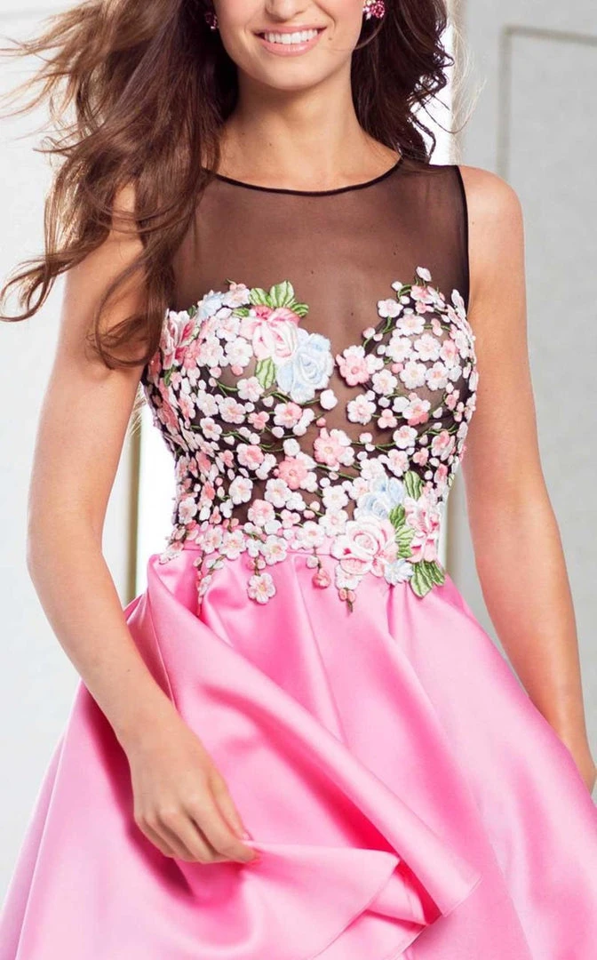 Bloom with loveliness in this detailed flowery short formal from Tarik Ediz 50002. The dress features a sleeveless, illusion jewel neckline with sheer bodice. Contrasting appliques add flowering accents from bust to waist gathers shape soft flutters along the contrasting skirt. This Tarik Ediz dress will let you celebrate that divine feminine beauty!