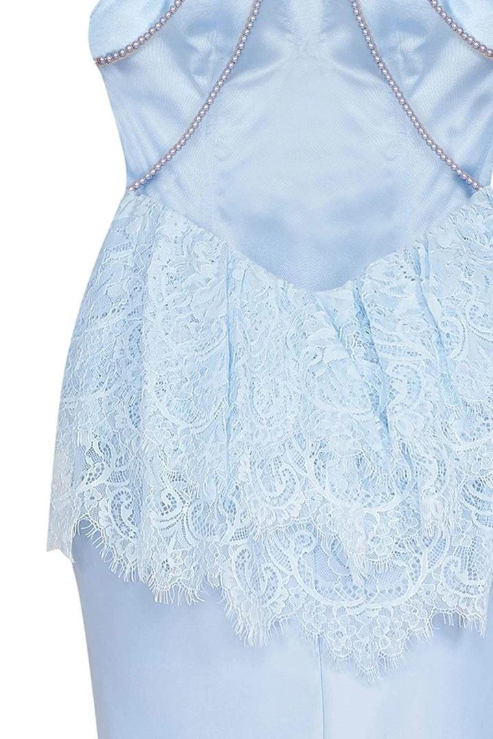 | Details: | Sleeveless, Pearl accents, Fitted bodice, Sheer fabric at the back, Ruffled lace detail, Mermaid skirt |