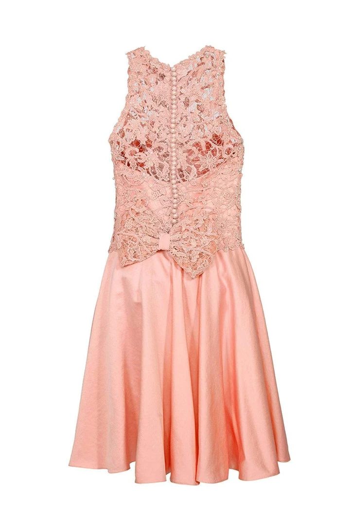 | Details: | Sheer lace overlay, Sleeveless, Bow accented back, Short hem |
