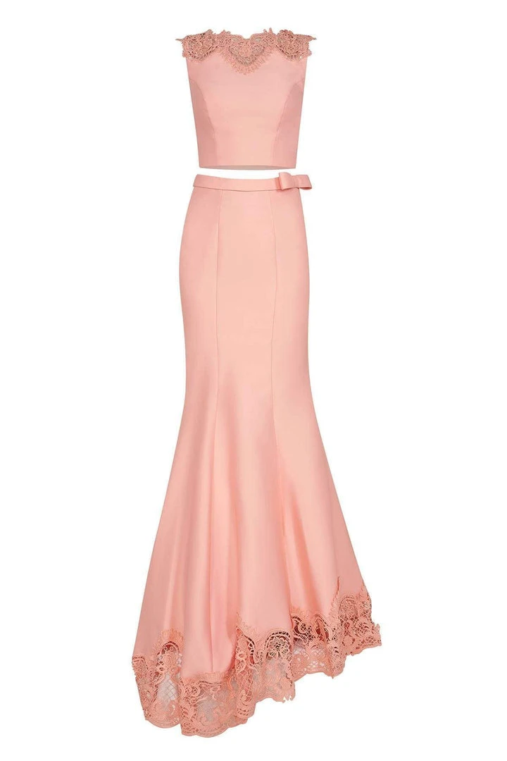 Get ready for another amazing two-piece prom dress that will have everyoneslking at Prom when you wear this Tarik Ediz 50049! Displays a sleeveless bodice and jewel neckline with curved lace insets along the neckline and princess seams that shape a regal fit. A bowed waistband accentuates the bare midriff, and sectional construction fit the contoured skirt. A sophisticated lace border charms the floor-brushing finish. This evening dress by Tarik Ediz is red carpet ready! Model is wearing Cream color.