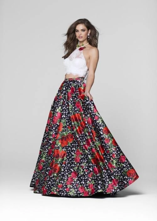 Fashion yourself glamorous in this lush two piece by Tarik Ediz 50038. Pearlescent beads form a gleaming necklace strap, and a beautiful rose supplies a fresh accent. The lace halter-style bodice boasts a sculpted fit atop a strapless lining while airy scalloped edging frames the bared midriff. A slender waistband debuts the contrasting skirt and bias-cut billows spill to a rippling full-length. Make it your moment to stand out wearing this lovely Tarik Ediz design.