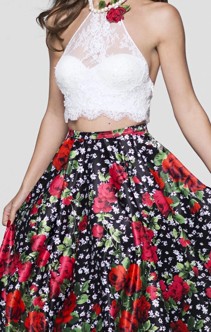 | Details: | Two-piece, Beaded neckline, Lace, Floral print, Open back |