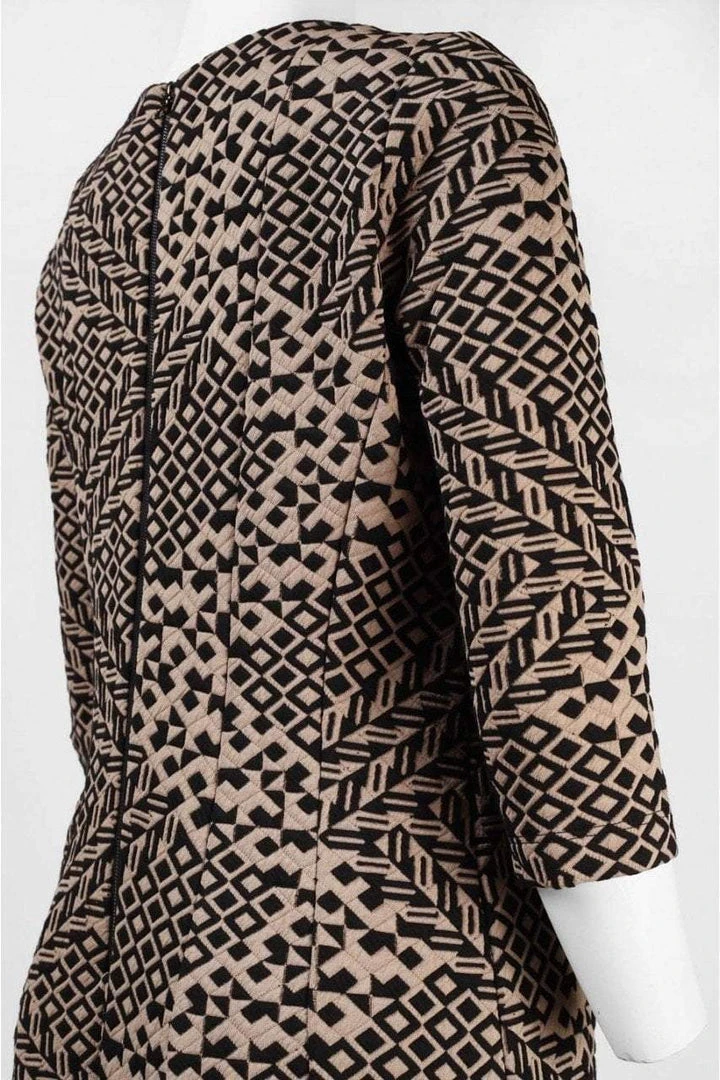 | Details: | Knit Jacquard, Geometric Print, Full Back, Back Zipper Closure, Quarter Sleeves, Seams, Flare Hem |