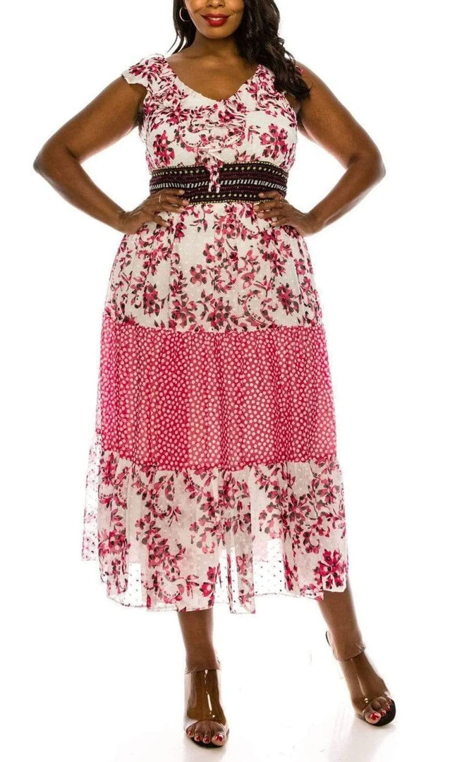 Revel in the vintage bohemian appeal of this Taylor 9713M creation. Designed with a floral chiffon silhouette, this beauty shows a v-neckline with ruffled trims that starts at the cap sleeves and meets on the bodice. The back has a v-open design and a Swiss dotted waistband. The tea length skirt flutters into an airy A-line silhouette. Impress everyone with the gorgeous style of this Taylor masterpiece.