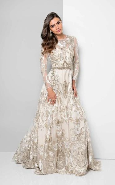 This designer gown shows two-toned embroidery, beaded appliques over a sheer fabric and full-length sleeves. This stunner also showcases a bateau illusion neckline and an intricately ornate A-line skirt that flows to a full-length hemline.