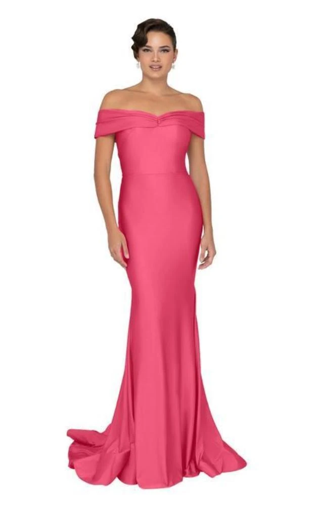 Indulge in appreciative glances when you flaunt your spectacular decadent style in this stunning evening gown by Terani Couture 1912P8283. This classy ensemble is crafted in solid spandex satin, features an off shoulder neckline and flawless form fitting bodice and a full length mermaid silhouette skirt that finishes with a dramatic train. Breathe verve and sophistication into your fabulous event in this fascinating Terani Couture masterpiece.