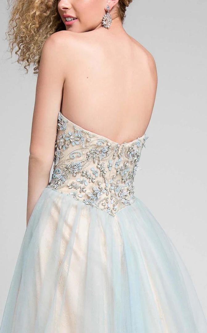 Render everyone speechless with this fabulous dress by Terani Couture 1711P2855. Dusty blue gold designer prom dress from our prom collection with a delicate bead bodice that has a 3D effect and picks up the 2 tone coloration of the lace lined skirt. This red carpet ready formal event gown is the perfect dress for your high school prom. This dress by Terani Couture creates a fun and exciting look.