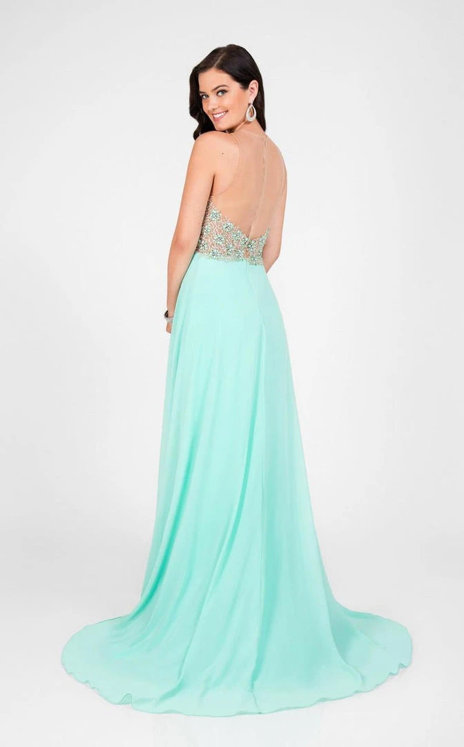 Elevate your sultry appeal when you slip on this embellished masterpiece by Terani Couture Prom 1712P2512. This ornate darling features an entirely sheer top on its plunging sweetheart neckline and low scoop back. Two-tone beadwork in rosette motifs dominates the fitted bodice. The A-line skirt accentuates your curves as it tapers to the floor and reveals a thigh high slit. Make a lasting impression as you float your way to the top of the fashionable crowd in this lovely embellished number by Terani Couture.