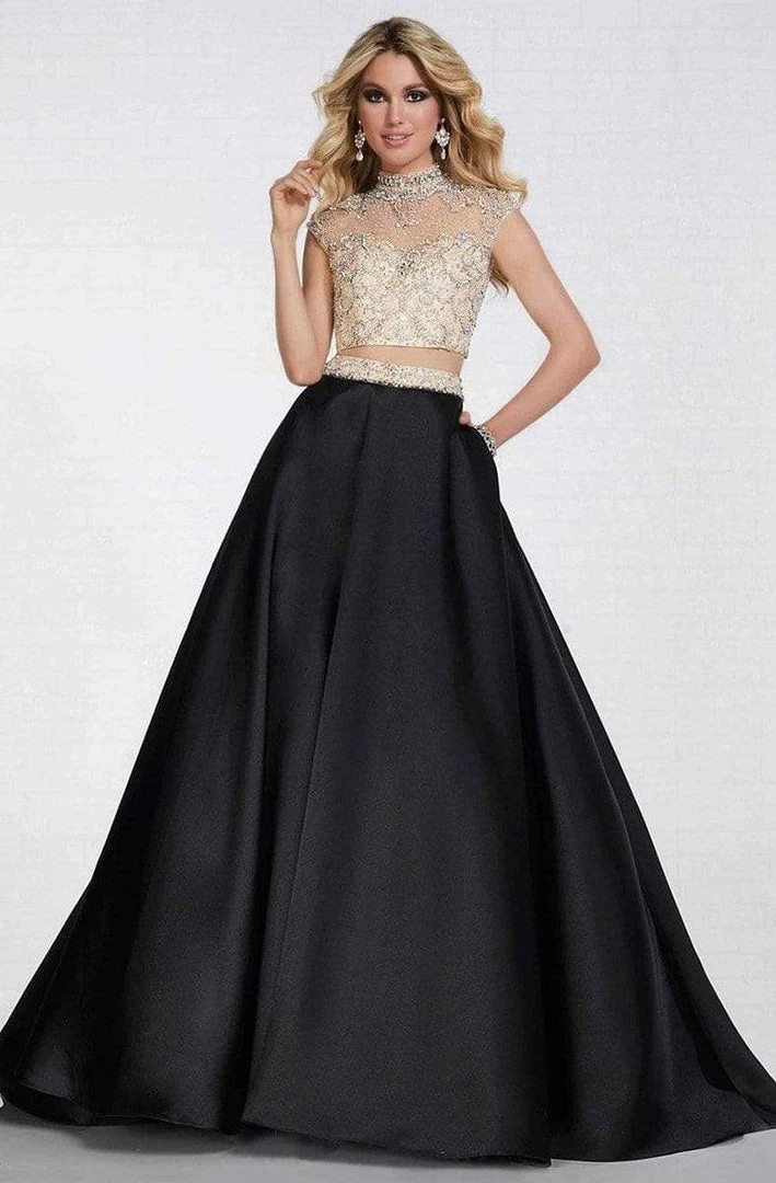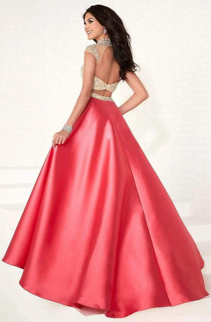 Look like a modern princess while you sparkle with the stunning iridescence of the old tinsel town in this Tiffany Designs 16277 creation. Embellished with a fascinating bejeweled design on a sheer bodice with a nude underlay, this regal piece showcases an illusion high neck over a sweetheart neckline. Framed with dainty cap sleeves and topped with a jewel adorned choker, this two-piece ensemble reveals an inverted-u cutout back. Bare at the midriff, the luxurious skirt is cinched at the waist with a contrast ornate band. The voluminous Mikado ballgown silhouette lushly cascade down to a stunning court train. Transform from a wallflower into the center of attention in this fabulously rendered Tiffany Designs masterpiece.